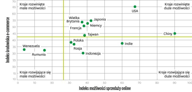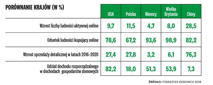 Według raportu CBRE „Zakupy przyszłości. Retail 2030”, w niedalekiej przyszłości handel detaliczny stanie się bardziej interaktywny, zarówno w trybie offline, jak i online. Co istotne, w obszarze e‑commerce perspektywy dla Polski są o wiele bardziej optymistyczne niż dla Niemiec, Wielkiej Brytanii czy Stanów Zjednoczonych. Z danych firmy badawczej Forrester wynika, że jedynym czynnikiem, który może spowolnić tendencję rozwojową, jest gospodarka kraju – choć tempo wzrostu PKB w Polsce jest znaczne, dochody do dyspozycji gospodarstwa domowego w porównaniu z wymienionymi krajami są nadal niskie (zobacz ramkę Gotowość do e‑handlu według wskaźnika Forrester).