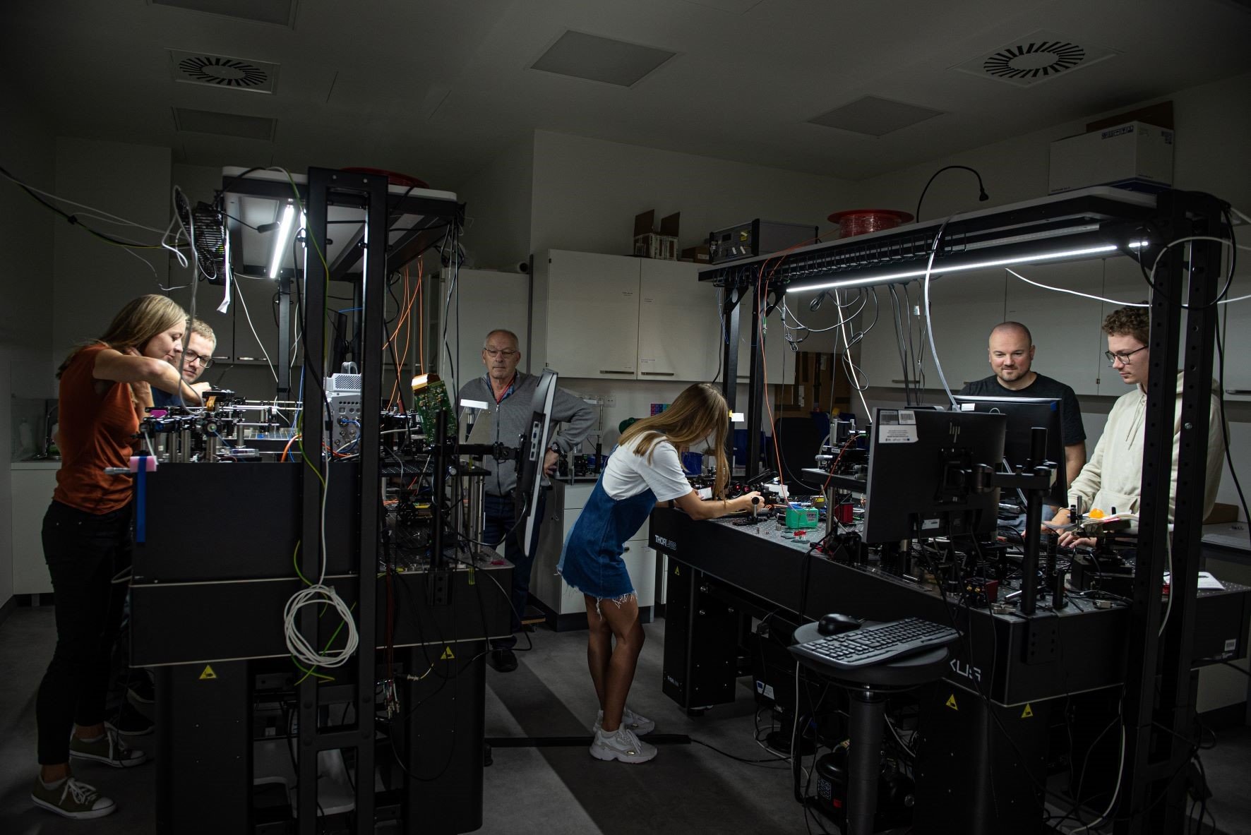 Projekt Międzynarodowe Centrum Badań Oka (MAB/2019/12) jest realizowany przez Instytut Chemii Fizycznej PAN w ramach programu Międzynarodowe Agendy Badawcze Fundacji na rzecz Nauki Polskiej, współfinansowanego przez Unię Europejską w ramach Europejskiego Funduszu Rozwoju Regionalnego. Dwójka doświadczonych badaczy wprowadza nowego członka Międzynarodowego Centrum Badań Oka w tajniki działania mikroskopu okulistycznego.