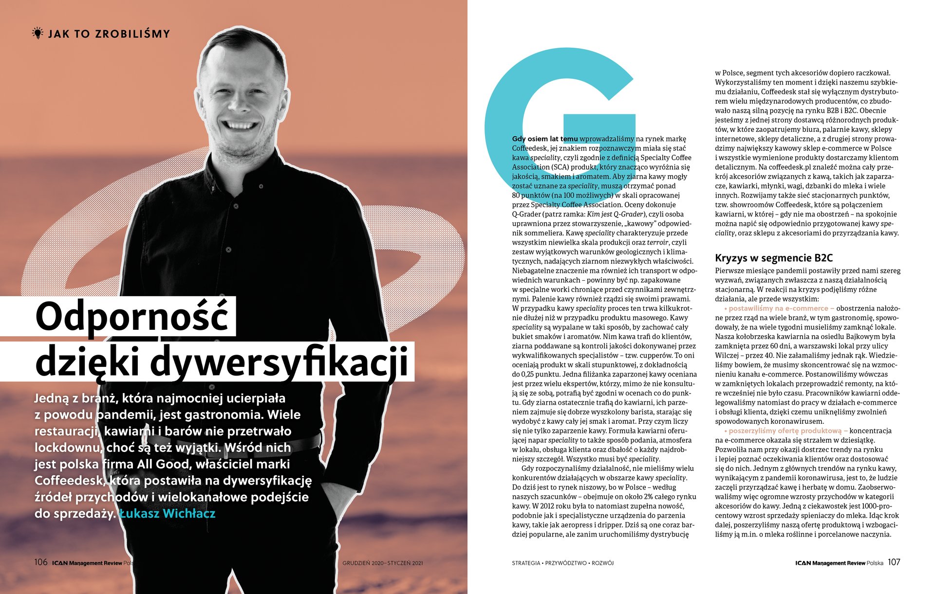 I jeden z największych problemów, czyli kryzys w sektorze gastronomicznym. Coffeedesk zaopatruje różnych klientów – nie tylko z branży gastronomicznej, ale również biura, sklepy e‑commerce, sieci sklepów detalicznych. To właśnie dzięki szerokiej bazie różnego rodzaju klientów udało się nam nadrobić straty powstałe w wyniku zmniejszenia zysków w segmencie HoReCa, który z powodu pandemii ucierpiał szczególnie. Firma postanowiła skoncentrować się na dotarciu do innych sklepów e‑commerce i na redystrybucji produktów. Rozwiązaniem problemu w obszarze B2B okazała się zatem dywersyfikacja źródeł przychodów.