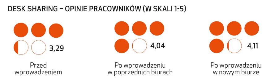 Ideę desk sharing testowaliśmy już w poprzednich naszych biurach. Wprowadziliśmy to rozwiązanie dla pracowników działów o dużej mobilności, których obowiązki polegają na uczestniczeniu w różnych spotkaniach na terenie biura lub poza nim, a ich stałe biurko często stało puste. Chcieliśmy przetestować współdzielenie biurek na własnym organizmie, by móc dzielić się doświadczeniami z klientami, a także sprawdzić realny wpływ tego rozwiązania na pracę. W związku z tym systematycznie monitorowaliśmy poziom satysfakcji pracowników i pytaliśmy ich o opinie. Analiza porównania ocen desk sharingu na przestrzeni czasu pokazała nam, że im dłużej pracownicy pracowali w tym systemie, tym lepiej recenzowali to rozwiązanie. Okazuje się, że dużo wyżej oceniamy desk sharing, jeśli mamy okazję poznać go w praktyce. Być może boimy się tego co nieznane?