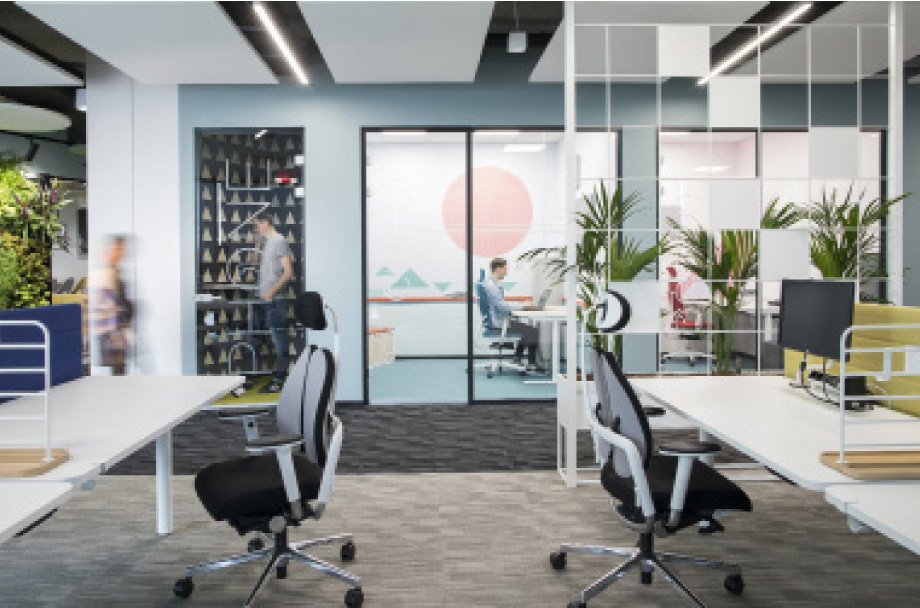 podział biura na trzy różne typy przestrzeni pracy – pokoje wieloosobowe, open space z przypisanymi stanowiskami, współdzielone biurka (desk sharing);