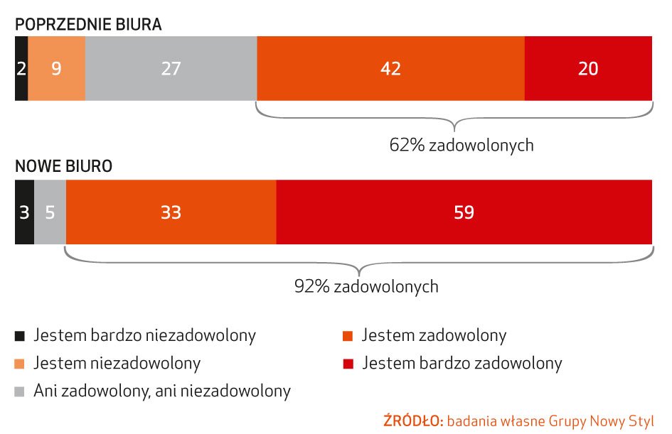 zadowolenie z biura znacząco wzrosło – 92% pracowników jest zadowolonych z obecnej przestrzeni.