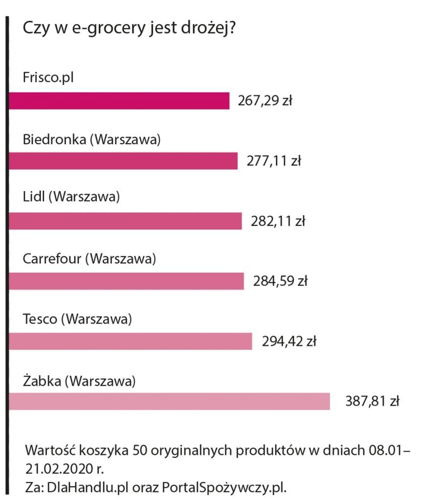Podobnego wysiłku ze strony całej branży wymaga wreszcie wypracowanie zmiany podejścia do kosztu zakupów. Klienci mają świadomość, że „musi być drożej”, bo przecież dowóz to określony koszt dla sklepu działającego online, więc musi mieć wpływ na ceny. Uważają zatem, że jeśli pójdą na zakupy i przyniosą je samodzielnie – na pewno się to opłaci. Trudno jest im wytłumaczyć, że sklepy online mogą szukać oszczędności gdzie indziej – choćby ze względu na brak sklepu stacjonarnego czy zautomatyzowany, zrobotyzowany magazyn. Dla wielu osób zaskoczeniem jest fakt, że przy porównaniu typowego koszyka zakupowego Frisco.pl wypada często taniej niż popularne polskie dyskonty czy hipermarkety. Wliczając w to koszty dostawy.