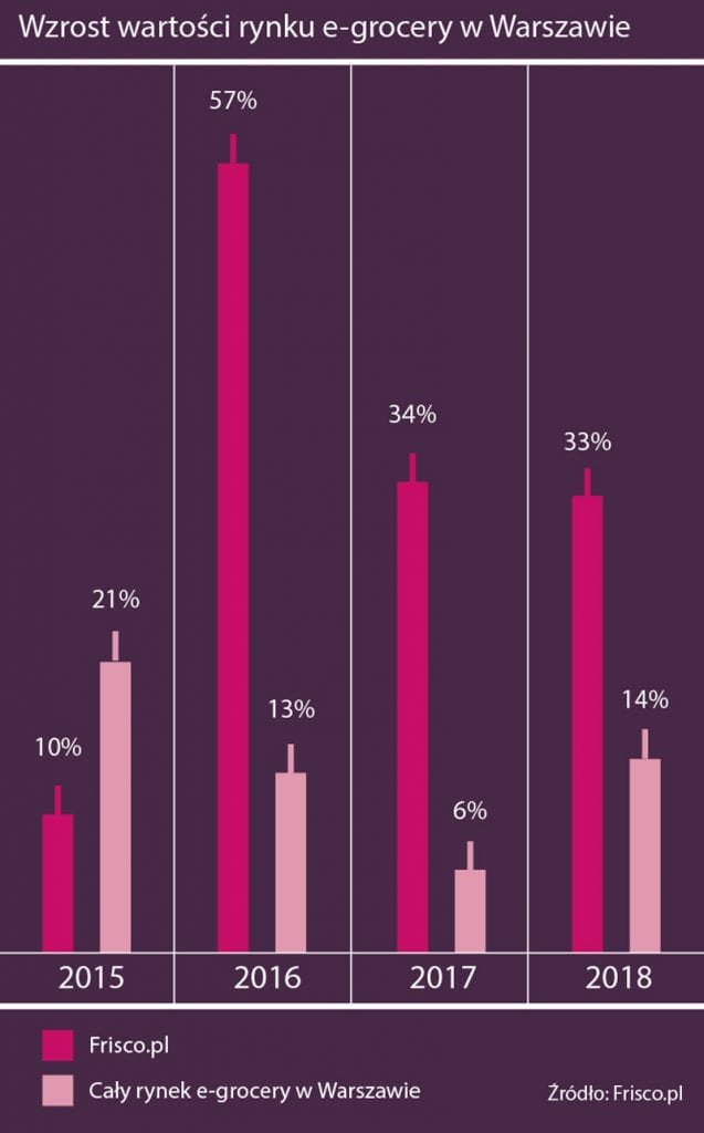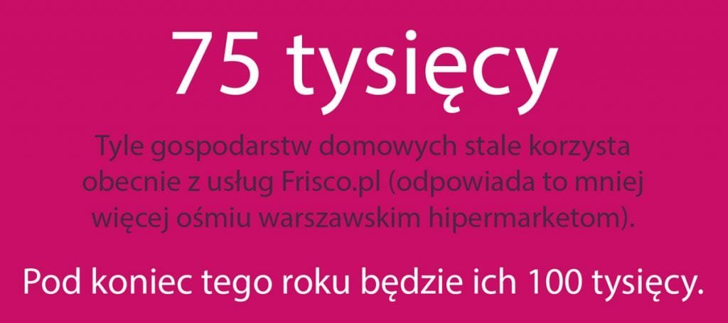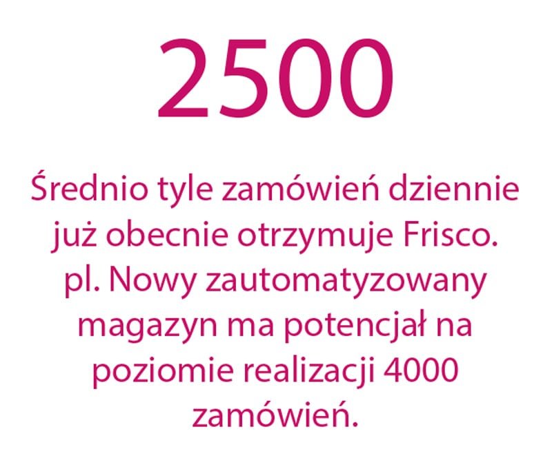 Frisco.pl rozpoczęło działalność, na długo zanim kupowanie żywności i produktów higienicznych online stało się modne – dopiero od pięciu lat branża rośnie w tempie 15–20% rocznie. Natomiast Witold Ferenc, twórca i wieloletni prezes firmy, założył ją już w 2006 roku. To wyprzedzanie teraźniejszości i wyprzedzanie trendów rynkowych, zanim zaczną być wyraźne, charakteryzuje Frisco.pl do tej pory. Obecnie oznacza to gotowość na dynamiczne zmiany skali działalności, zaczynające dotyczyć całego rynku e‑grocery. Dlatego niecały rok temu Frisco.pl zainwestowało w stworzenie ogromnego, mocno zautomatyzowanego magazynu, oferującego potencjał, który nawet w chwili obecnej (po zanotowaniu 30‑procentowego wzrostu liczby zamówień) wykorzystywany jest tylko w ok. 60%.
