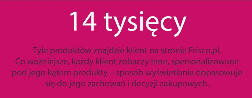 Wręcz „oczywistym” zestawem rozwiązań stosowanych przez Frisco.pl są wszelkie technologie służące do zmaksymalizowania oferty wyświetlanej klientowi odwiedzającemu stronę sklepu. Nie chodzi tu tylko o jego decyzje zakupowe, ale każde zachowanie, każdą interakcję z witryną. Podczas pierwszej wizyty każdemu wyświetlane są promocje, natomiast wystarczy jedno kliknięcie (np. na sekcję Nowości albo Diety), by zaczął być już tworzony profil odwiedzającego, przekładający się na to, co jest mu wyświetlane.