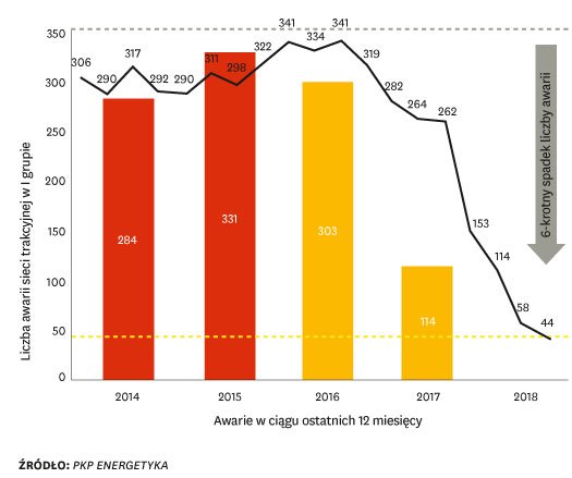 Wprowadzenie Planera pozwoliło naprawić obszary wadliwe oraz te, które pozornie działały dobrze, ale mogły działać znacznie lepiej. Digitalizacja zapewniła nam lepszy nadzór nad przeglądami pociągów i skłoniła do wprowadzenia zasad ciągłego doskonalenia kaizen. W efekcie czas przeglądu zmalał z 60 do 30 dni, a dostępność pociągów wzrosła z 80 do 100%. Lepsze alokowanie zasobów przyniosło wyraźny wzrost produktywności, mimo że tempo pracy zostało utrzymane. Równocześnie odnotowaliśmy znaczącą poprawę w obszarze jakości. W ciągu trzech lat liczba usterek sieci trakcyjnych spadła sześciokrotnie oraz dwukrotnie zmalały czasy reakcji i przywracania zasilania w przypadku zdarzeń kryzysowych czy katastrof pogodowych (zobacz ramkę Liczba awarii sieci trakcyjnej PKP PLK).