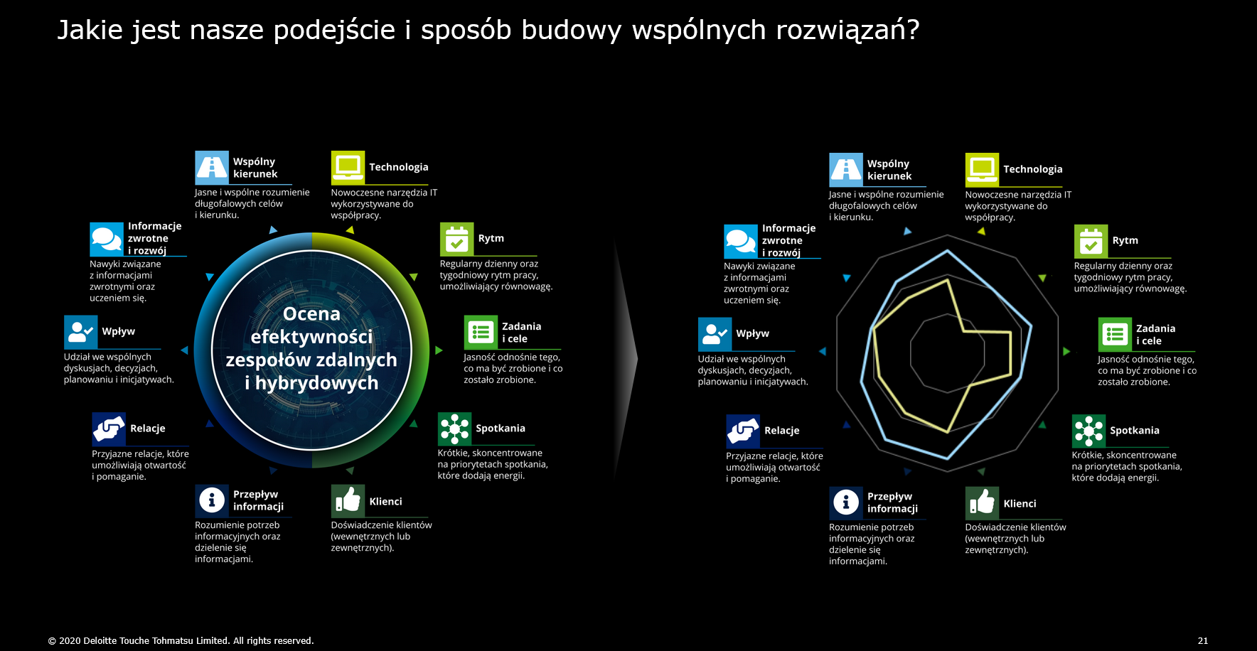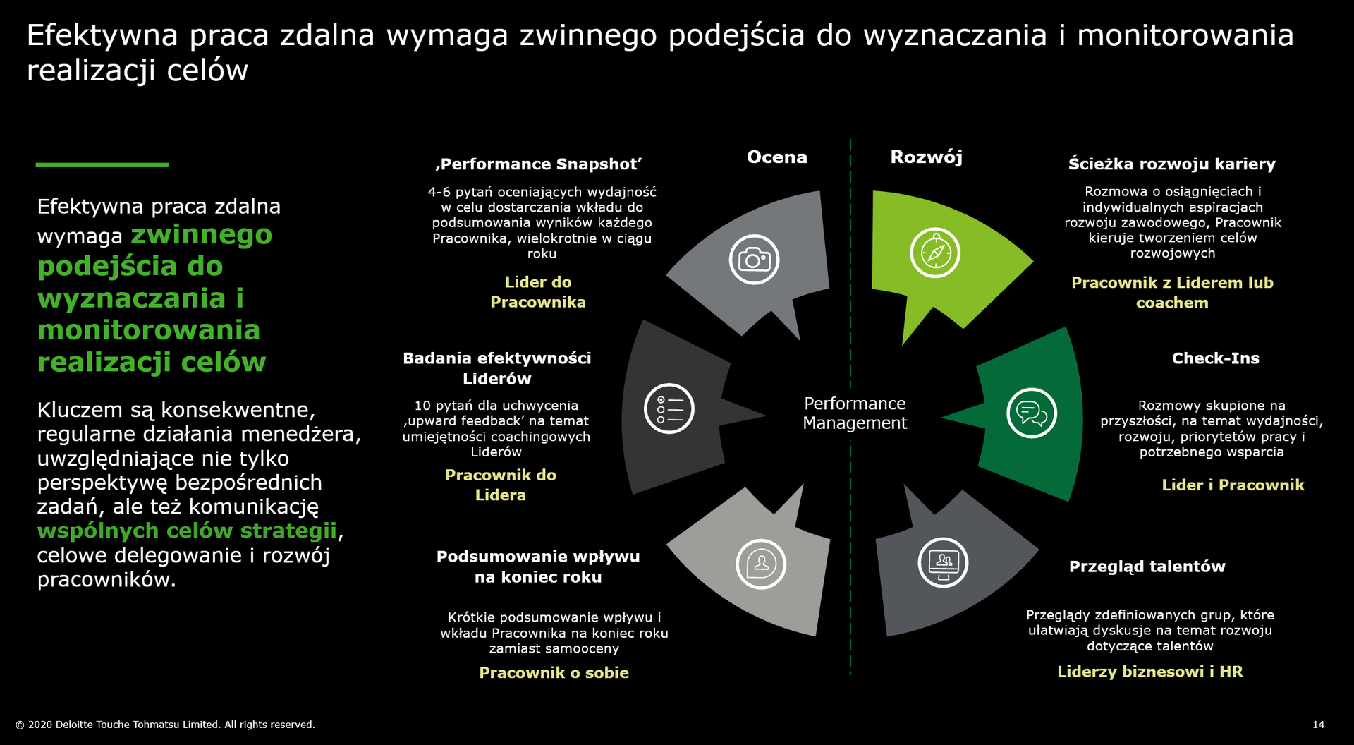 Efektywna praca zdalna wymaga zwinnego podejścia do wyznaczania i monitorowania realizacji celów. Duże firmy wskazują na konieczność poprawienia komunikacji w zespole i wprowadzenie częstszych rozmów o przyszłości z członkami zespołów, co pozwoli odpowiednio dostosować cele i wsparcie, które pomoże je osiągnąć.