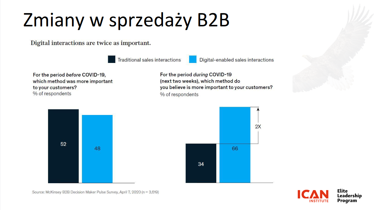 Przed pandemią COVID‑19 tradycyjna sprzedaż B2B odgrywała podobną rolę co nowoczestne, cyfrowe formy sprzedaży. Po pojawieniu się koronawirusa te proporcje zmieniły się diametralnie. Obecnie aż dwukrotnie więcej przedstawicieli dużych firm przepytanych przez McKinsey Institute woli korzystać z cyfrowych kanałów sprzedaży B2B niż osobistych spotkań z handlowcami. Jednocześnie dane pokazują, że osoby zajmujące się tym zagadnieniem nie wiedzą do końca w jaki sposób wykorzystywać nowe kanały sprzedaży. Tymczasem większość przedsiębiorców preferuje spotkania online w formie wideokonferencji niż np. rozmowę telefoniczną.