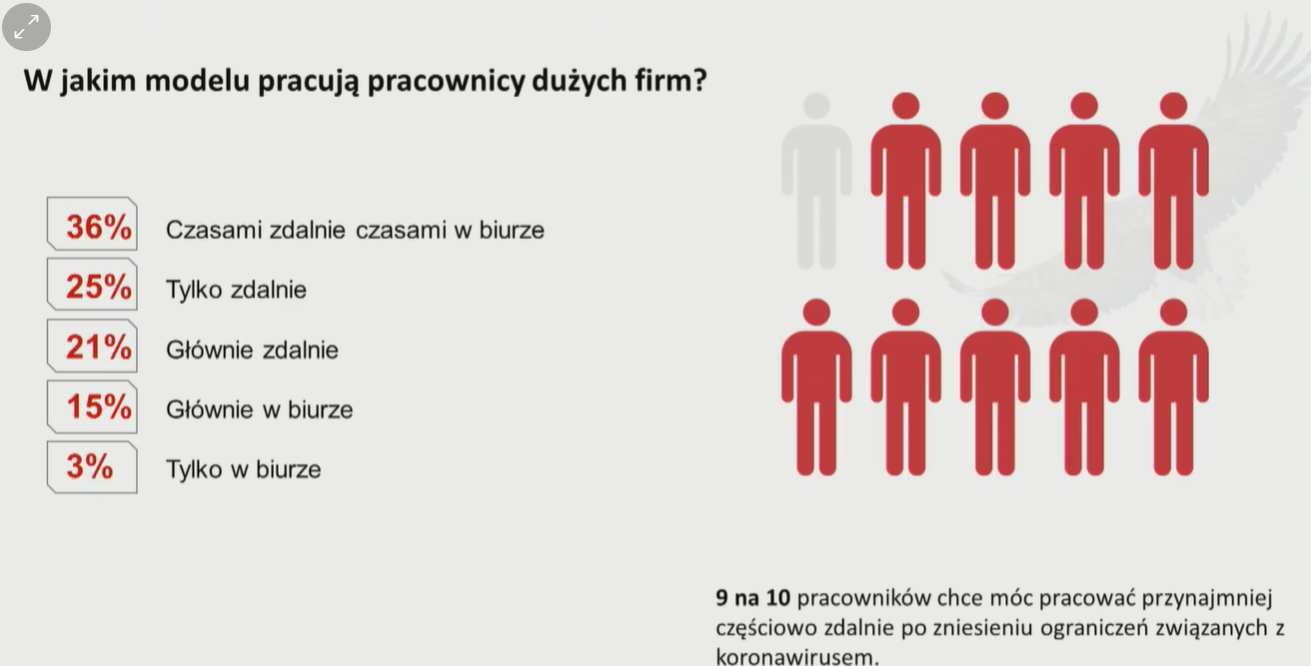 Praca zdalna nie jest żadną nowością. Już w czerwcu 2019 roku 7% pracowników dużych firm pracowało zdalnie bądź hybrydowo. Dziś ten odsetek – z powodu pandemii – wynosi 89%.