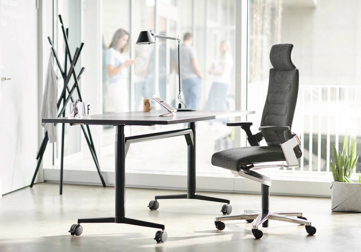 Dzięki mobilnemu i składanemu stołowi można zawsze pracować tam, gdzie jest miejsce i panują dobre warunki. W ofercie dostępne są także modele z automatyczną regulacją wysokości, co pozwala przełączać się między siedzeniem a staniem. Do tego dochodzi wygodne tapicerowane krzesło ruchome, które pomaga promować tę zmianę postawy. System: Timetable Lift, projekt: Andreas Störiko, ON swivel chair, projekt: wiege.