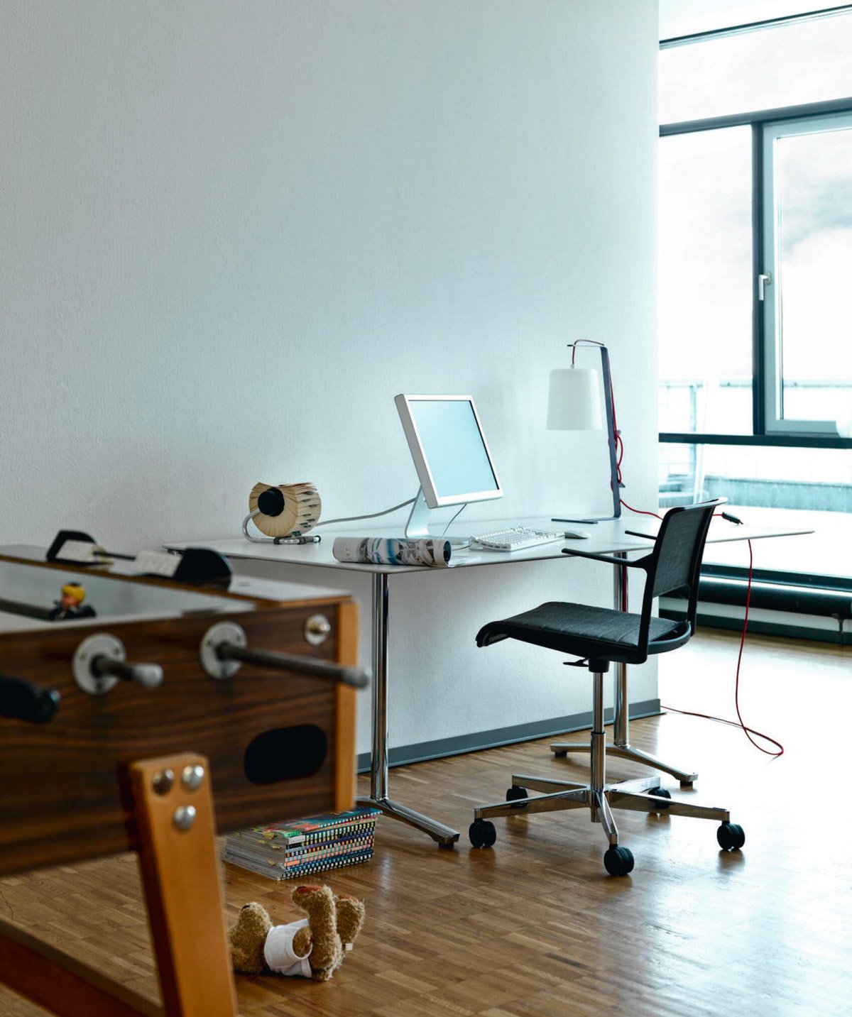 W przypadku kompaktowego stołu o wymiarach 140 cm x 70 cm wystarczy wolny narożnik. Cienkie blaty wykonane z HPL w jednolitym kolorze nie wprowadzają typowego wyglądu mebli biurowych, a jednocześnie są solidne i tak neutralne, że niepozornie wtapiają się w przestrzeń mieszkalną. Proste krzesło obrotowe z przezroczystą siatkową tapicerką zapewnia komfort siedzenia. System stołu i krzeseł obrotowych Aline, projekt: Andreas Störiko.