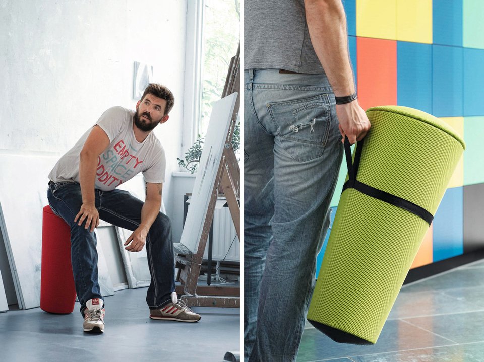 Aktywne przerwy: lekki, przenośny i zajmujący znacznie mniej miejsca, niż piłka do siedzenia stołek „Stand‑Up” pozwala biodrom obracać się, wspomagając skupienie. W ten sposób aktywność fizyczna łączy się z kontemplacją umysłową. Projekt: Thorsten Franck.
