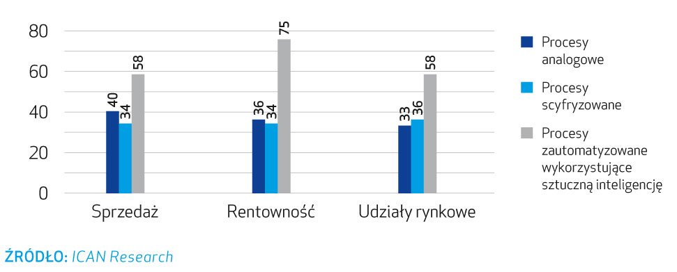 Inwestowanie w systemy IT optymalizujące procesy wiąże się z dużymi kosztami. Czy zatem warto to robić? Na jaką skalę? Według opinii naszych respondentów warto, ale trzeba mieć sensowną strategię. Okazuje się, że przemyślany plan inwestycyjny, rozpisany na konkretne działania, terminy oraz szacunkowe wydatki, pozwala na osiągnięcie zdecydowanie lepszych wyników niż działanie ad hoc. Cyfryzacja biznesu to za mało, trzeba go wprowadzać w nowy wymiar, opierając się na najnowszych trendach i technologii. Tylko wtedy można zostawić konkurencję daleko w polu. Z badań ICAN Research wynika bowiem, że jedynie zautomatyzowane procesy wykorzystujące sztuczną inteligencję pozwalają organizacjom rozwijać się szybciej niż pozostałe. Nie ma znaczenia, czy pozostałe firmy działają analogowo, czy są wpisane w tradycyjny system informatyczny – i tak osiągają podobne wyniki. Przyczyn tego stanu może być wiele, np. przestarzały system albo słabe wdrożenie (zobacz ramkę Udział polskich przedsiębiorstw osiągających lepsze wyniki niż konkurencja, działających w modelach: analogowym, cyfrowym i zautomatyzowanym).