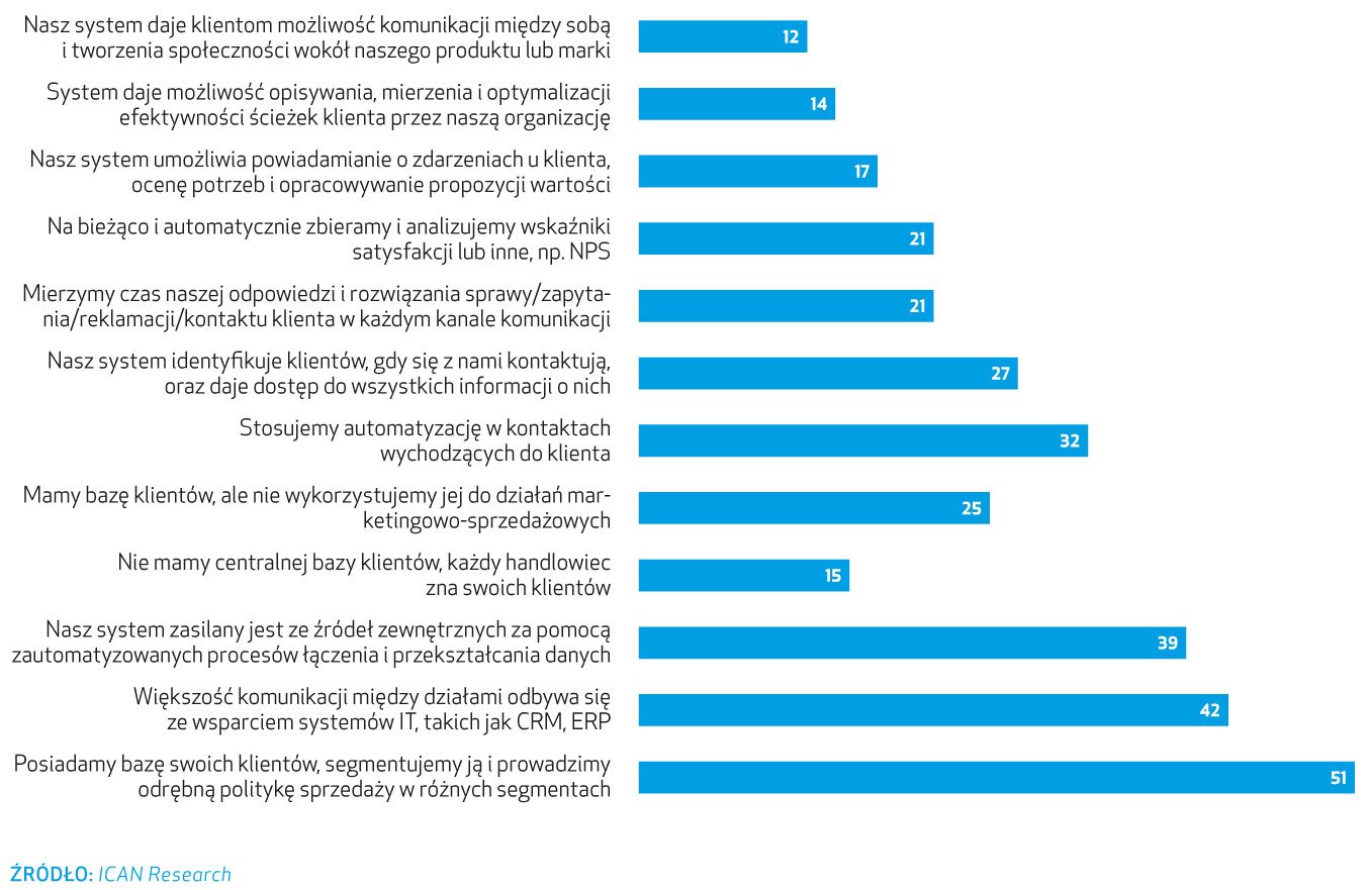 Jak więc należy rozumieć zaawansowaną cyfryzację i budować dzięki niej swoje atuty konkurencyjne? Według opinii respondentów ICAN Research, aż 75% organizacji posiadających zautomatyzowane systemy CRM wykorzystujące sztuczną inteligencję osiąga lepsze wyniki niż konkurencja. To samo można powiedzieć o 16% firm działających analogowo i 56% skoncentrowanych na efektywności. Sytuacja jest mocno niepokojąca, bo połowa polskich przedsiębiorstw nie wykorzystuje bazy klientów do żadnych działań, traktując ją jak książkę telefoniczną, a nie źródło realizowania większej sprzedaży. Jak widać, potencjał jest ogromny, ale prawie niewykorzystywany.