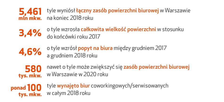 Jak te wszystkie innowacje i trendy wpływają na rynek? Niewątpliwie sprawiają, że firmy chętnie rozglądają się za nowymi siedzibami, które mogłyby stanowić nie tylko reprezentacyjne miejsce pracy, ale także narzędzie do podtrzymywania wysokiej motywacji pracowników oraz przyciągania nowych talentów. Między innymi właśnie to zapotrzebowanie skutecznie zachęca inwestorów do realizowania kolejnych budynków (zobacz ramkę Warszawski rynek biurowy w liczbach). „Rok 2018 był z pewnością rekordowy pod bardzo wieloma względami – podkreśla Kałędkiewicz. – Wynika to m.in. z rozwoju firm działających już w Polsce. Wraz ze zdobywaniem kolejnych klientów i zatrudnianiem nowych pracowników zaczynają potrzebować coraz więcej przestrzeni do pracy. Dlatego biznes co jakiś czas wynajmuje dodatkową przestrzeń. Z drugiej strony cały czas mamy nowych graczy na rynku. Popyt napędzają wreszcie fuzje firm. Po pewnym czasie od połączenia zarządy zaczynają poważnie brać pod uwagę przeniesienie wszystkich operacji do wspólnej siedziby, co znacząco usprawnia codzienną działalność”.