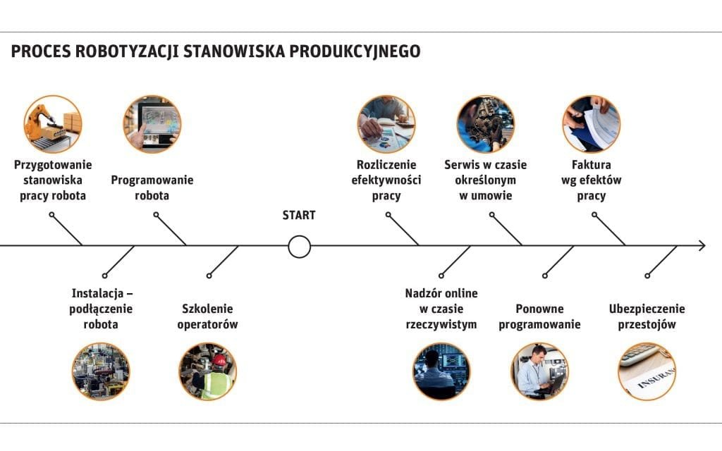 Przeprowadzone przez nas badania doprowadziły do wniosku, że istnieją trzy główne blokady masowego wykorzystania robotów na liniach produkcyjnych w Polsce: brak środków na inwestycje, zbyt długi planowany okres zwrotu oraz brak dostępu do kadry inżynierów doświadczonych w obszarze robotyzacji. Rozwiązaniem wychodzącym naprzeciw czynnikom ograniczającym zastosowanie robotów w Polsce jest formuła robotów jako usługi (RaaS), zainicjowana w roku 2018 po raz pierwszy w Polsce przez platformę DBR77.com. Jest to podejście typowe dla ery współużytkowania. Współdzielimy dziś już nie tylko samochody (Uber), ale nawet biura (WeWork) czy mieszkania (Airbnb). Podobnie może być ze zautomatyzowaną linią produkcyjną. Po co kupować robota, skoro można kupić wynik jego pracy? Innowacyjność modelu RaaS polega na odejściu od konieczności zakupu, instalacji i posiadania robota na rzecz zakupu efektu jego pracy. Innymi słowy: podobnie jak pracownik agencji pracy tymczasowej nie jest pracownikiem zatrudnionym przez zakład, tak wynajęte roboty nie stają się własnością firmy. Zadania realizowane przez agencję pracy robotów obejmują wiele czynności, których celem jest organizacja procesów produkcyjnych, tak by były optymalne pod względem kosztowym. Proces z punktu widzenia klientów jest dość prosty. Usługa obejmuje kilka głównych działań: