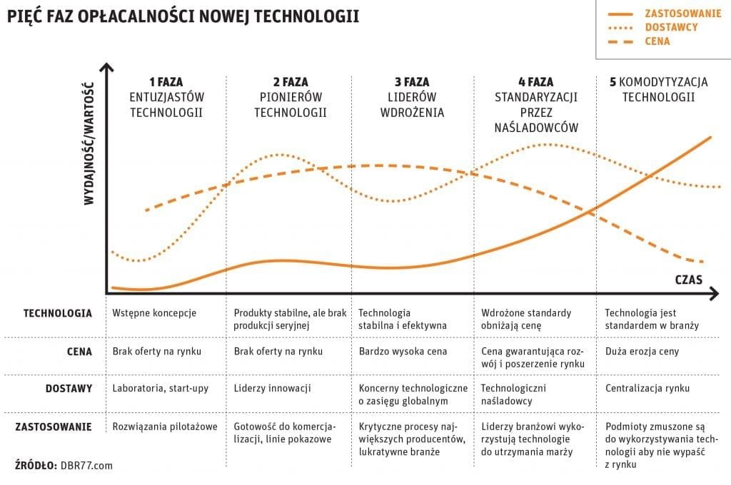 Procesy automatyzacyjne będą się dokonywać w miarę poprawy ich opłacalności ekonomicznej i dostępności rozwiązań technologicznych. Każda odkrywcza technologia wchodząca na rynek przechodzi przez kilka faz, w których obserwujemy zupełnie odmienne zachowania inwestorów, rynku i dostawców tej technologii oraz różne sposoby kształtowania ceny rynkowej. Innowatorzy często sięgają po daną technologię już wtedy, gdy jej wykorzystanie nie jest jeszcze opłacalne. Jednakże masowa popularyzacja każdej technologii zaczyna się dopiero wtedy, kiedy całkowity koszt jej stosowania jest niższy niż koszty dotychczasowych metod pracy. Staje się ona wtedy standardem, którego przestrzeganie jest wymogiem koniecznym przetrwania firmy na rynku. Tak działo się już z wieloma innowacyjnymi technologiami, poczynając od produkcji samochodów upowszechnionej dzięki działaniom Henry’ego Forda. (Zobacz ramkę Pięć faz opłacalności nowej technologii).