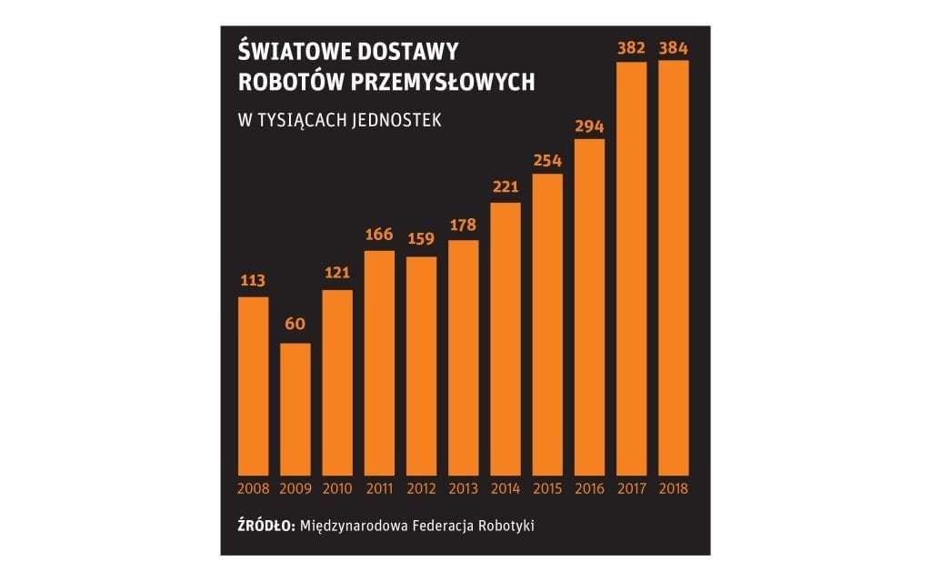 Równocześnie, według danych Międzynarodowej Federacji Robotyki (IFR), rok 2018 był kolejnym rekordowym rokiem pod względem liczby zainstalowanych robotów przemysłowych, gdyż na całym świecie sprzedano ponad 384 tysiące tych wyspecjalizowanych urządzeń (zobacz ramkę Światowe dostawy robotów przemysłowych).