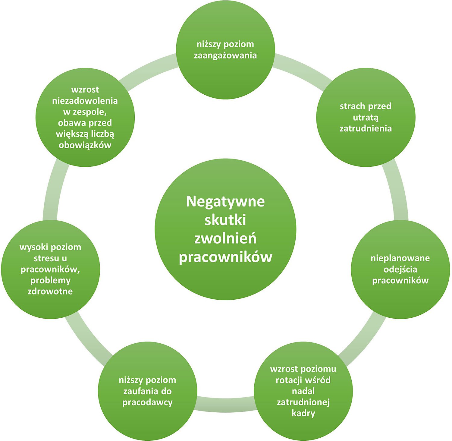 Indeks dolny Grafika pokazuje negatywne skutki zwolnień pracowników. Jeżeli pracodawcy nie będą o nich pamiętać, to narazić mogą się na utratę tych członków zespołów, którzy powinni pozostać w organizacji. Komunikacja skierowana do zatrudnionej kadry, informująca o rzeczywistych przyczynach zwolnień, będzie z pewnością gwarancją pozostania pracowników, a otwartość i transparentność, pomogą zniwelować negatywne emocje. (źródło: opracowanie własne autora) Indeks dolny koniecGrafika pokazuje negatywne skutki zwolnień pracowników. Jeżeli pracodawcy nie będą o nich pamiętać, to narazić mogą się na utratę tych członków zespołów, którzy powinni pozostać w organizacji. Komunikacja skierowana do zatrudnionej kadry, informująca o rzeczywistych przyczynach zwolnień, będzie z pewnością gwarancją pozostania pracowników, a otwartość i transparentność, pomogą zniwelować negatywne emocje. (źródło: opracowanie własne autora)