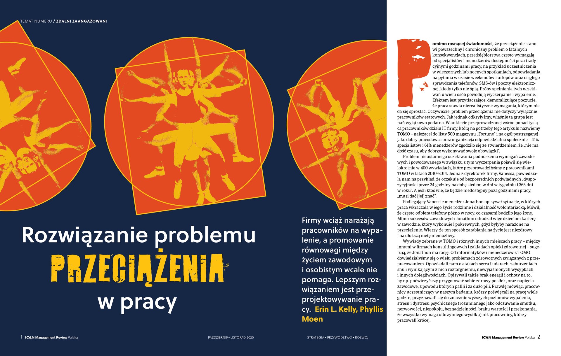 Pomimo rosnącej świadomości, że przeciążenie stanowi powszechny i chroniczny problem o fatalnych konsekwencjach, przedsiębiorstwa często wymagają od specjalistów i menedżerów dostępności poza tradycyjnymi godzinami pracy, na przykład uczestniczenia w wieczornych lub nocnych spotkaniach, odpowiadania na pytania w czasie weekendów i urlopów oraz ciągłego sprawdzania telefonów, SMS‑ów i poczty elektronicznej, kiedy tylko nie śpią. Próby spełnienia tych oczekiwań u wielu osób powodują wyczerpanie i wypalenie. Efektem jest przytłaczające, demoralizujące poczucie, że praca stawia nierealistyczne wymagania, którym nie da się sprostać. Oczywiście, problem przeciążenia nie dotyczy wyłącznie pracowników etatowych. Jak jednak odkryłyśmy, właśnie ta grupa jest nań wyjątkowo podatna. W ankiecie przeprowadzonej wśród ponad tysiąca pracowników działu IT firmy, którą na potrzeby tego artykułu nazwiemy TOMO – należącej do listy 500 magazynu „Fortune” i na ogół postrzeganej jako dobry pracodawca oraz organizacja odpowiedzialna społecznie – 41% specjalistów i 61% menedżerów zgodziło się ze stwierdzeniem, że „nie ma dość czasu, aby dobrze wykonywać swoje obowiązki”.