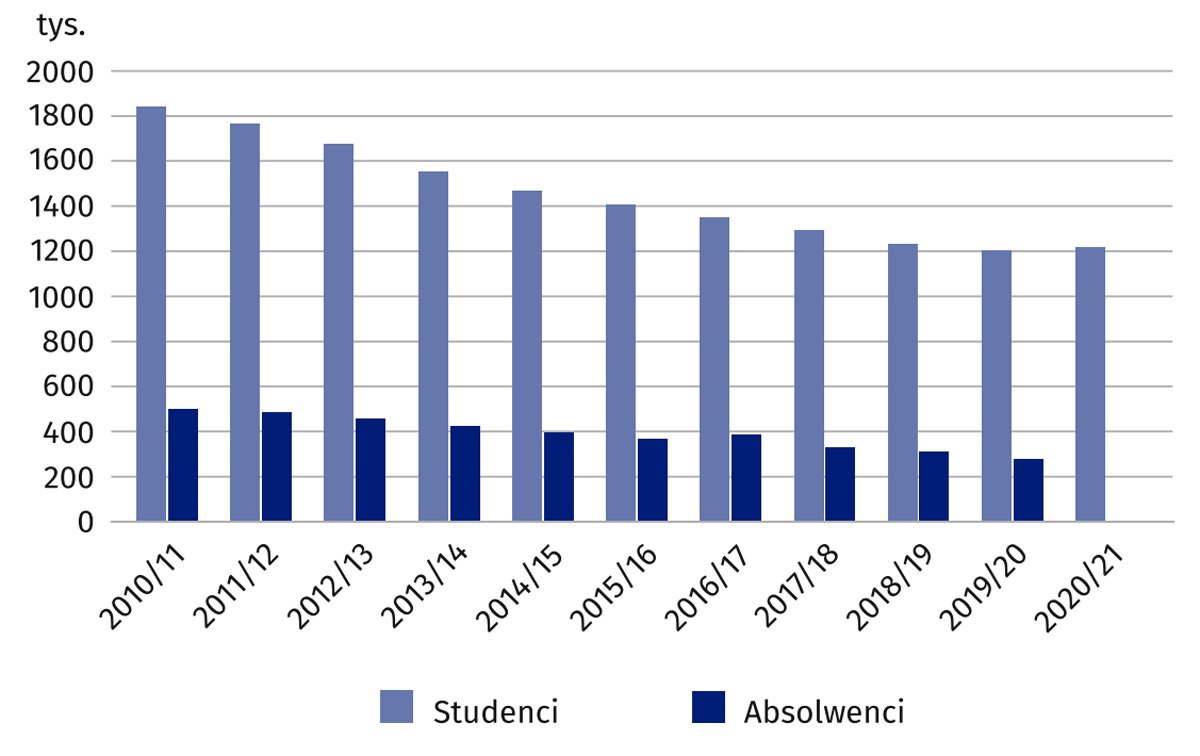 „W ostatnich latach liczba studentów systematycznie zmniejszała się (z 1841,3 tysiąca w roku akademickim 2010/11 do 1204 tysięcy w roku akademickim 2019/20), natomiast w roku akademickim 2020/21 nastąpił niewielki wzrost do 1215,3 tys. osób, w tym 69,8% w uczelniach publicznych. Systematyczny spadek zaobserwowano również w odniesieniu do liczby absolwentów, których liczba zmniejszyła się z 497,5 tysiąca w roku akademickim 2010/11 do 293,4 tysiąca osób w roku akademickim 2019/20 (jedynie w roku akademickim 2016/17 zanotowano niewielki wzrost) – to dla odmiany cytat z raportu przygotowanego przez GUS Szkolnictwo wyższe w roku akademickim 2020/2021.