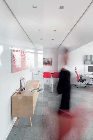 Po piętnastu miesiącach od pierwszej wizyty u klienta stworzyliśmy zupełnie nową przestrzeń. Środowisko pracy stało się nowoczesne, elastyczne i wspierające pracujących tam ludzi. Powstały przestrzenie do współpracy oraz pracy w skupieniu. Liczba i wielkość sal spotkań zostały dopasowane do potrzeb pracowników. W dziale handlowym, którego pracownicy bardzo często przebywają poza siedzibą firmy, zmniejszyliśmy liczbę stałych stanowisk pracy, wprowadzając współdzielone biurka (desk sharing). Pojawiły się także pomieszczenia i miejsca wspierające pracę kreatywną, jak również powierzchnie do regeneracji oraz integracji. Działając zgodnie z przyjętą metodologią projektowania zorientowanego na użytkownika (user centered design), skupiliśmy się na pracownikach, stawiając ich w centrum każdej aktywności. Daliśmy ludziom wybór miejsca pracy i możliwość kontroli otoczenia. Na końcu nauczyliśmy ich korzystać z dostarczonych rozwiązań i narzędzi.