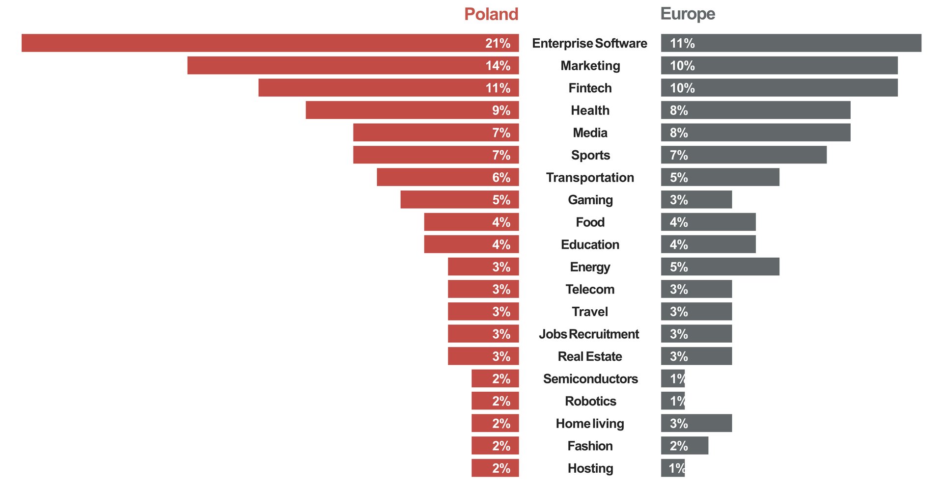 Polska siła specjalistów IT znajduje swoje odzwierciedlenie w branży startupowej. Jak czytamy w badaniu „Polish and CEE tech ecosystem outlook”, zrealizowanym przez dealroom.co przy współpracy z Polskim Funduszem Rozwoju (PFR) – w porównaniu do Unii Europejskiej Polska wykazuje większą koncentrację start‑upów w dziedzinie oprogramowania dla przedsiębiorstw, rozwiązań marketingowych i gier.