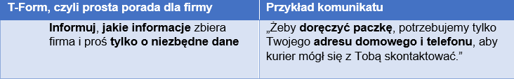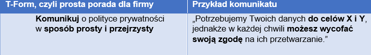 Nie wystarczy informować o tym, w jakim celu przetwarzamy dane osobowe. Istotny jest również sposób, w jaki to robimy. Przede wszystkim należy unikać wykorzystywania zbyt wielu trudnych, specjalistycznych terminów i przedstawić wszystkie komunikaty w przystępny, przyjazny i przejrzysty sposób, informując, po co są nam potrzebne dane użytkownika i jak je wykorzystamy.