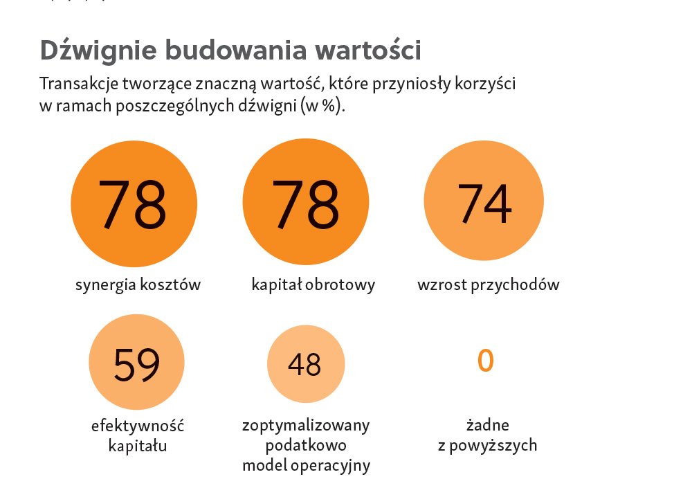 Z badania przeprowadzonego na stu funduszach PE wynika, że redukcja kosztów – jedno z głównych narzędzi tradycyjnie stosowanych przez sektor PE do zapewnienia opłacalności transakcji – już nie wystarcza, aby generować zwrot w trudnych warunkach rynkowych. Spełnienie oczekiwań dotyczących zwrotu z inwestycji wymaga znacznej koncentracji na dźwigniach tworzenia wartości, które tradycyjnie były postrzegane przez inwestorów PE i finansowych jako zbyt złożone i trudne do kontrolowania (zobacz ramkę Dźwignie budowania wartości).