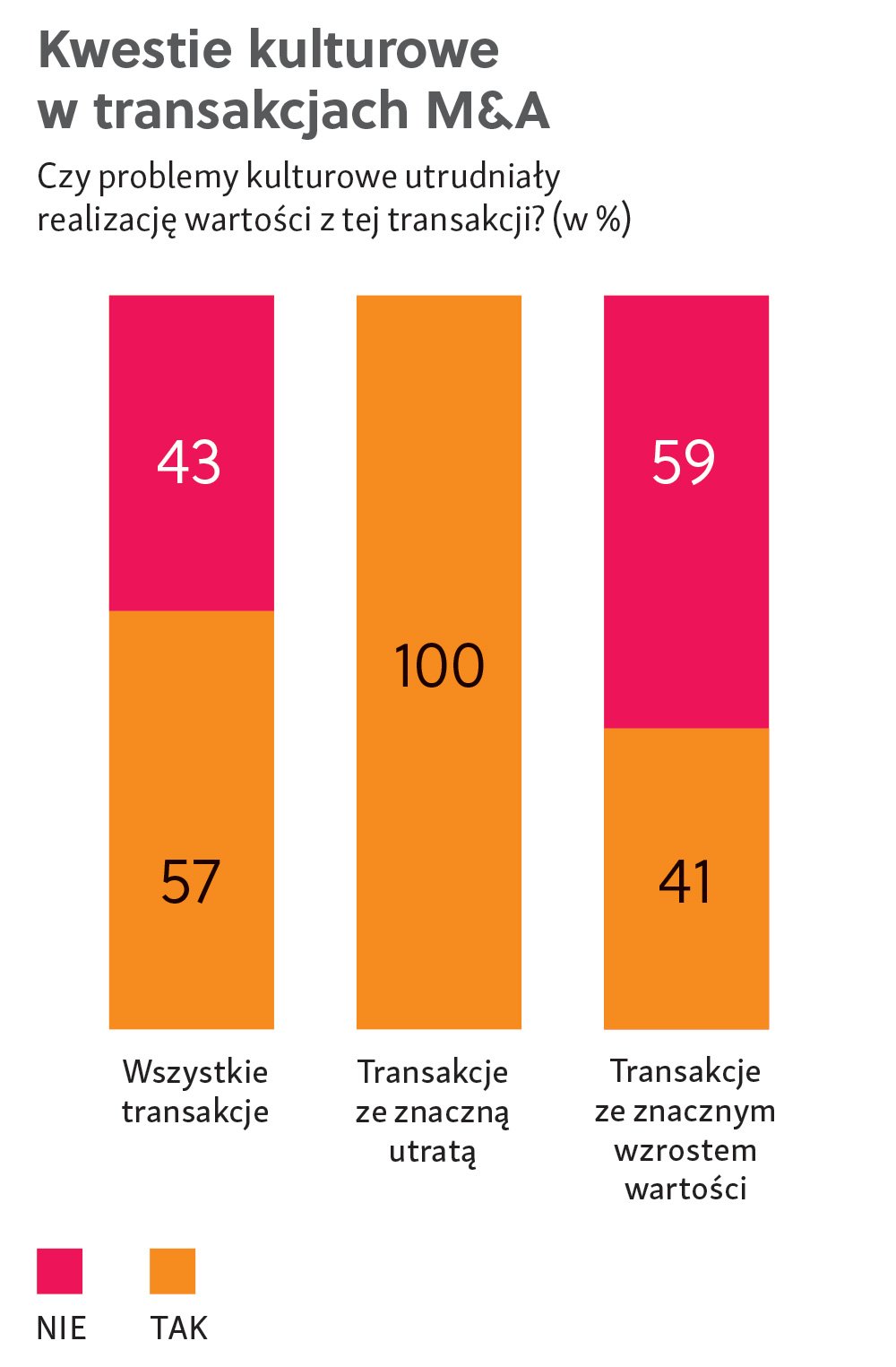 W przypadku wszystkich transakcji, które nie wygenerowały wartości, organizacje zawsze traciły ponad 10% kluczowych pracowników zaraz po podpisaniu umowy kupna‑sprzedaży. Na utratę wartości przejmowanych przez PE aktywów miały wpływ również kwestie kulturowe. Podobny mechanizm działał w przypadku korporacji: okazuje się, że 82% firm, które zgłaszały znaczną utratę wartości, straciło ponad 10% kluczowych pracowników po domknięciu transakcji. Tak więc umiejscowienie kultury w centrum planowania transakcji jest ważne dla wszystkich inwestorów, choć generalnie spółki koncentrują się intensywniej na kwestiach dotyczących kadry (zobacz ramki: Kwestie kulturowe w transakcjach M&A oraz Kluczowi pracownicy w transakcjach M&A).