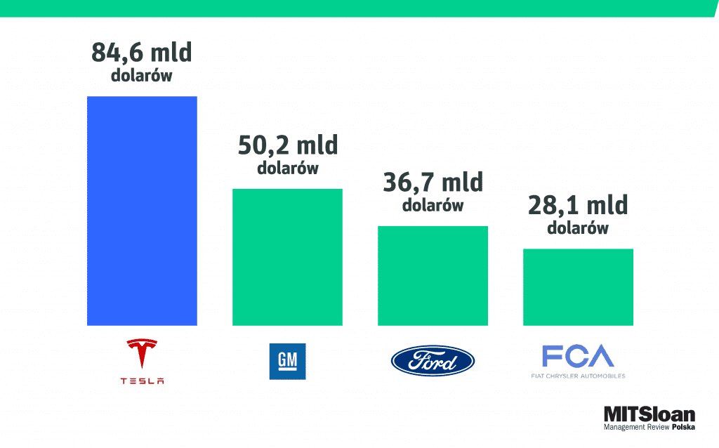 A tak naprawdę Tesla wyceniana jest w tym momencie wyżej niż niemal wszystkie firmy motoryzacyjne świata, poza Volskwagenem (ok. 100 mld dolarów) i Toyotą (ok. 230 mld dolarów).