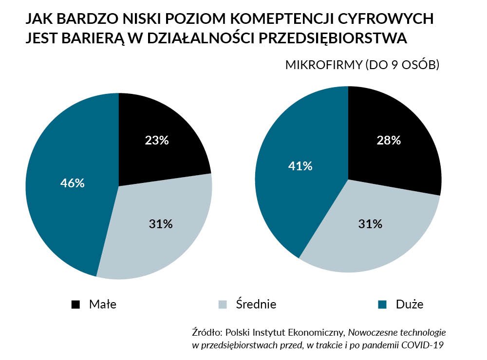 Sklep, który wymienia informacje ze smartfonem w naszej kieszeni i rejestruje w czasie rzeczywistym zakupy, to nic innego jak zaawansowany przykład działania internetu rzeczy (Internet of Things). Idea urządzeń, które się ze sobą komunikują dawno wykroczyła poza domowych asystentów w rodzaju Siri czy Amazon Echo, połączonych z telewizorem i oświetleniem w domu. Wielkim skokiem i rewolucją, która dzieje się na naszych oczach, jest komunikacja bez pośrednictwa użytkownika, np. między autonomicznymi samochodami, które już jeżdżą po amerykańskich i europejskich drogach. Ich kierowcy wciąż zobowiązani są do trzymania rąk na kierownicy, a funkcję autopilota można włączyć wyłącznie na autostradach. Nietrudno wyobrazić sobie, że technologia, coraz doskonalsza i sprawniejsza (m.in. dzięki uczeniu maszynowemu), szybko znajdzie zastosowanie w logistyce przedsiębiorstw – sortowniach paczek, firmach kurierskich i spedycji, nie tylko w obiektach pokroju gigantów w rodzaju Amazona. Roboty produkowane przez Boston Dynamics – słynne czworonożne automaty – już teraz realnie pomagają i „obchodzą” w dużej mierze zautomatyzowane elektrownie wodne Illwerke w austriackich Alpach. Pracę, którą do tej pory wykonywał inżynier (sprawdzenie temperatury na poszczególnych przewodach, stan dokręcenia zaworów), wykonuje robot zaprogramowany i „przyuczony” do poruszania się po elektrowni przez wyspecjalizowaną firmę. Usieciowienie, całkowite niemal przeniesienie komunikacji z klientem i pracownikiem do przestrzeni internetowej, elektroniczny obieg dokumentów sprawiły, że infrastruktura informatyczna stała się absolutnie kluczowa dla funkcjonowania biznesu i z tego powodu wrażliwa na ataki. W badaniach przeprowadzanych przez PIE i ALTUM firmy wskazywały na konieczność doszkalania pracowników w zakresie kompetencji cyfrowych. W raporcie PIE 46% badanych firm uznało niski poziom kompetencji cyfrowych pracowników za dużą barierę w działalności przedsiębiorstwa. Brak tych kompetencji może zwiększać ryzyko wycieku, kradzieży danych, włamań hakerskich. Gdy zasoby firmy są przechowywane w chmurze, z jednej strony ułatwiają dostępność i kluczową dla skutecznego biznesu wymianę informacji, z drugiej ułatwiają proceder szpiegostwa przemysłowego.