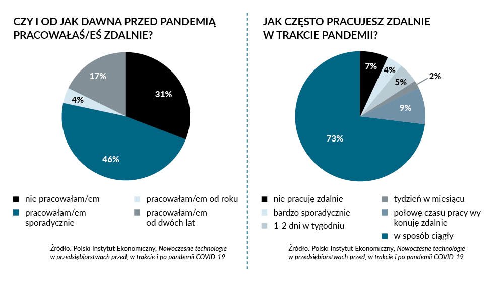 PRZEZ DWA LATA światowa gospodarka, a wraz z nią także polscy przedsiębiorcy, musiała odnaleźć się w rzeczywistości, w której pojawiły się takie zjawiska, jak: kwarantanna, samoizolacja, ograniczona mobilność, testy sprawdzające obecność wirusa, maseczki i… praca zdalna lub hybrydowa. Dla biznesu to właśnie nowe modele pracy okazały się jedną z najważniejszych zmian, a zanosi się na to, że zostaną na dobre. To z kolei ma swoje implikacje. W raporcie Future Business Institute Praca zdalna – rewolucja, która się przyjęła aż 76% badanych pracowników z małych, średnich i dużych przedsiębiorstw nie miało okazji przed pandemią pracować zdalnie lub robiło to tak sporadycznie, że w zasadzie można uznać, że dla tych osób było to doświadczenie marginalne. Ale już w czasie pandemii… 72% ankietowanych pracowało wyłącznie zdalnie. W efekcie 71% pracowników przyznaje, że obecnie możliwość zdalnej pracy jest dla nich ważna bądź bardzo ważna. Przez dwa lata zdążyliśmy wokół tego modelu zorganizować swoje życie. Nic więc dziwnego, że aż 61% ankietowanych uważa, że jest dobrze przygotowanych do tej formy pracy.