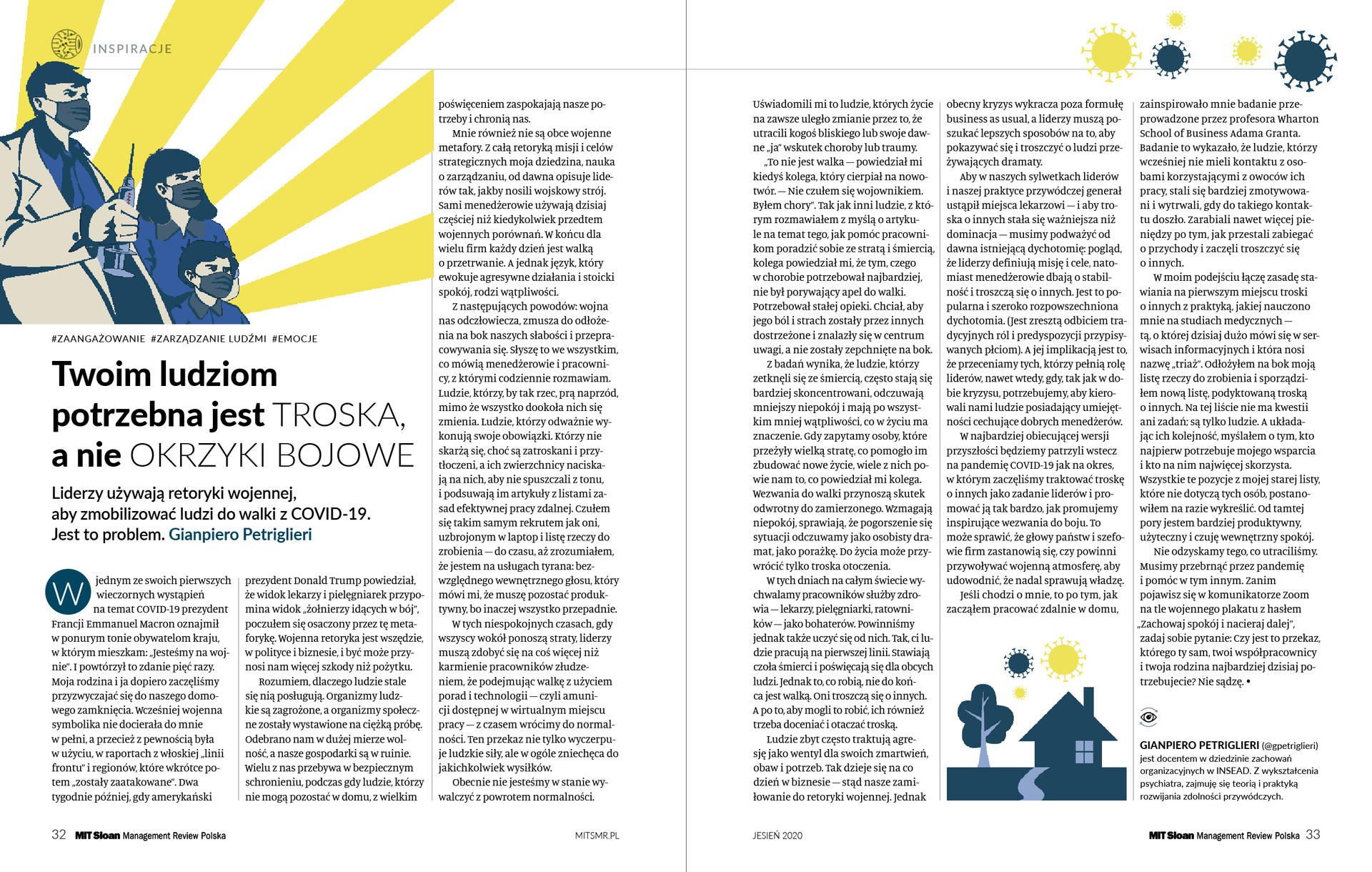 Ludzie zbyt często traktują agresję jako wentyl dla swoich zmartwień, obaw i potrzeb. Tak dzieje się na co dzień w biznesie – stąd nasze zamiłowanie do retoryki wojennej. Jednak obecny kryzys wykracza poza formułę business as usual, a liderzy muszą poszukać lepszych sposobów na to, aby pokazywać się i troszczyć o ludzi przeżywających dramaty.
