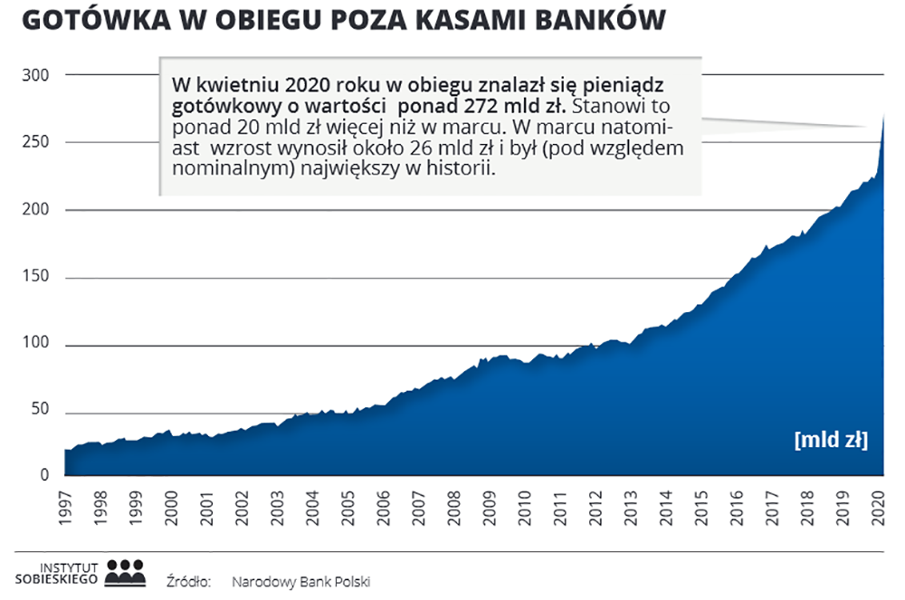 Pod tym względem Polacy zachowują się inaczej niż Brytyjczycy – w kwietniu w obiegu gotówkowym było 272 miliardy złotych. Największy miesięczny wzrost w historii pod względem nominalnym nastąpił w marcu, kiedy do obiegu trafiło 26 miliardów złotych. Eksperci z Instytutu Sobieskiego jako możliwy powód tej sytuacji wskazują lęk Polaków przed problemami systemu bankowego. Na szczęście te obawy nie sprawdziły się i w przeciwieństwie do kryzysu z 2008 roku, nie mieliśmy do czynienia z załamaniem systemu finansowego. Mimo to, wiele osób zdecydowało się wycofać swoje oszczędności z banków, co jednak nie przełożyło się na wzrost płatności gotówkowych, w przeciwieństwie do elektronicznych.