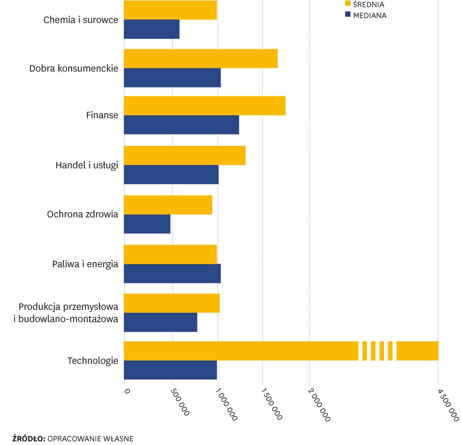 Już pierwszy rzut oka na wartości średnie wynagrodzeń całkowitych wystarczy, by dostrzec dominację spółek technologicznych. To rezultat pojedynczych, dużych debiutów giełdowych i wspomnianych zmian właścicielskich w tej branży, które uruchomiły ponadprzeciętne płatności dla zarządzających. Odmiennie prezentuje się sytuacja, kiedy spojrzymy na wartość mediany, czyli na to, ile wynosi wartość graniczna, gdyby podzielić te populacje po połowie. Okazuje się, że najlepiej opłacani menedżerowie pracują w finansach, w sektorze dóbr konsumpcyjnych (FMCG) oraz w sektorze paliwowo‑energetycznym (zobacz ramkę Średnia i mediana wynagrodzenia całkowitego). Wynik ten nie wydaje się zaskakujący i odpowiada zarówno naszym trendom historycznym, jak i tym obserwowanym na rynkach zagranicznych.