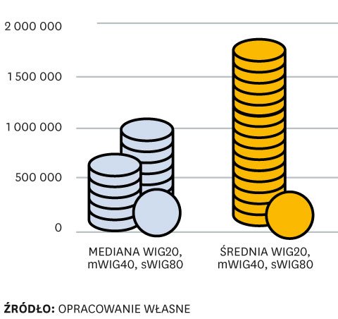 Analizując wartości wynagrodzeń całkowitych w dużych i średnich spółkach giełdowych na rynku polskim, można dostrzec znaczącą różnicę pomiędzy medianą i średnią arytmetyczną. Oznacza to, że kilka podmiotów oferujących skrajnie wysokie wynagrodzenia całkowite istotnie podbija wartość średnią, która dla tej grupy przedsiębiorstw wynosi ponad 1,7 miliona złotych. Trzeba zatem pamiętać, że tę wartość zawyżają pojedyncze, szczególnie wysokie wypłaty dla menedżerów w spółkach, w których występują zmiany właścicielskie. Dużo bardziej miarodajna dla całego rynku firm dużych i średnich jest wartość mediany (zobacz wykres Wynagrodzenie całkowite dla spółek w indeksach WIG20, mWIG40, sWIG80).