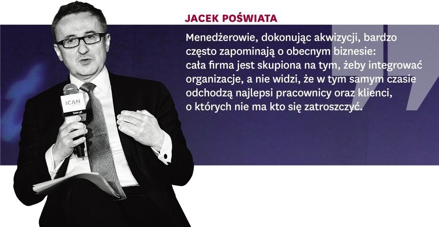 Jacek Poświata: W przypadku fuzji i przejęć największa destrukcja wartości nie wynika z faktu, że ktoś kupił coś zbyt drogo, tylko z tego, że proces integracji po zakupie nie był dobrze przeprowadzony. Badania pokazują, że 50–70% akwizycji nie kończy się pełnym sukcesem, gdyż proces integracji był źle zarządzany. I dlatego doradzamy naszym klientom, żeby zawsze zwracali uwagę na to, czy są dobrze przygotowani do transakcji. Menedżerowie, dokonując akwizycji, bardzo często zapominają o obecnym biznesie: cała firma jest skupiona na tym, żeby integrować i łączyć organizacje, a nie widzi, że w tym samym czasie odchodzą najlepsi ludzie niepewni swojej przyszłości oraz co jeszcze gorsze uciekają klienci, o których nie ma kto się zatroszczyć.