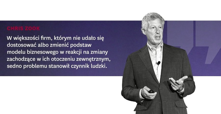 Chris Zook: W większości analizowanych przeze mnie przypadków firm, którym nie udało się dostosować albo zmienić podstaw modelu biznesowego w reakcji na zmiany zachodzące w ich otoczeniu zewnętrznym, sedno problemu stanowił czynnik ludzki. I to niezależnie od tego, ile czasu na reakcję mieli decydenci i pracownicy. Do podobnych wniosków doszedł Irving Janis, psycholog z Uniwersytetu Yale, który przeanalizował serię zakończonych niepowodzeniem posunięć rządu, takich jak inwazja w Zatoce Świń na Kubie. Odkrył, że w każdym przypadku podjęcia błędnej decyzji liderzy i uczestnicy danej operacji odfiltrowywali ważne informacje z zewnątrz i odrzucali alternatywne punkty widzenia, które nie potwierdzały tego, w co chcieli wierzyć (syndrom myślenia grupowego).