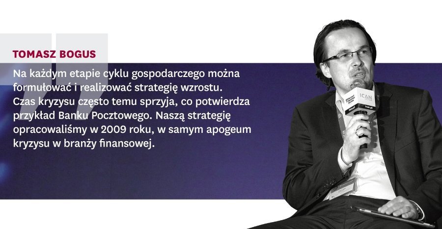 Tomasz Bogus: Na każdym etapie cyklu gospodarczego można formułować i realizować strategię wzrostu. Czas kryzysu często temu sprzyja, co potwierdza przykład Banku Pocztowego. Naszą strategię opracowaliśmy w 2009 roku, w samym apogeum kryzysu w branży finansowej. W jej ramach zdefiniowaliśmy kilka czynników, które są unikalne dla naszej instytucji i które możemy wykorzystać mam tu na myśli dotarcie do klientów nieubankowionych i wykorzystanie do tego celu kanałów dystrybucji Poczty Polskiej. Okazało się, że paradoksalnie sytuacja kryzysowa nam pomogła. W 2009 banki zaostrzyły bardzo kryteria przyznawania kredytów, dzięki czemu mogliśmy skuteczniej dotrzeć z ofertą do naszej grupy docelowej. Wykorzystaliśmy tę szansę, bo byliśmy odpowiednio przygotowani mieliśmy dobrą strategię i odpowiedzieliśmy sobie na trzy kluczowe pytania: do kogo chcemy dotrzeć, z czym chcemy dotrzeć i jak chcemy to zrealizować. Takie podejście przynosi pozytywne efekty nie tylko w sektorze bankowym.