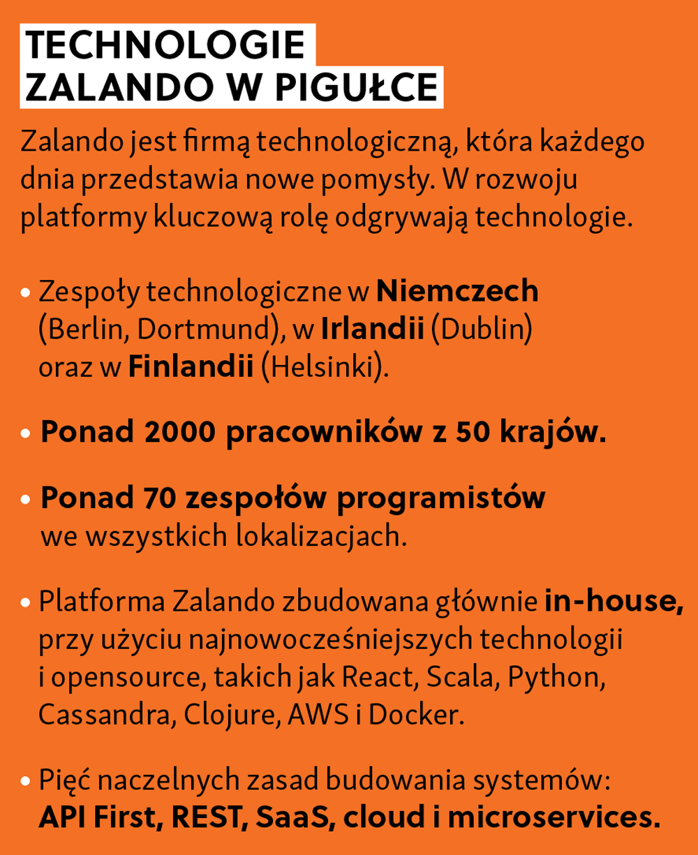 Podstawą modelu biznesowego Zalando zawsze była chęć stworzenie platformy oferującej wiele różnych brandów i marek. Jednym z fundamentów naszego funkcjonowania jest centralizacja działań. Zalando opiera się na tym, że większość rozwiązań powstaje wewnętrznie, dlatego firma przyciąga pracowników o potrzebnych kompetencjach. W tym tkwi nasza siła technologiczna (zobacz ramkę Technologie w Zalando).