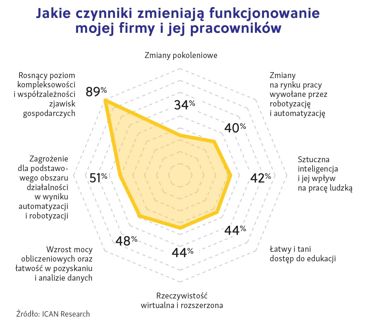 Zdecydowana większość ankietowanych (89%) stwierdziła, że rosnący poziom kompleksowości i współzależności zjawisk gospodarczych silnie wpływa na ich organizację. Największy wpływ na zachodzące w przedsiębiorstwach zmiany, zdaniem badanych, będzie miała automatyzacja i robotyzacja (51%). Na drugim miejscu znajduje się wzrost dostępnych mocy obliczeniowych oraz spadek kosztów pozyskania, przesyłu i analizy danych (48%). W następnej kolejności wymieniano wpływ (po 44%) rozszerzonej i wirtualnej rzeczywistości oraz łatwego dostępu do darmowej edukacji (zobacz ramkę Jakie czynniki zmieniają funkcjonowanie mojej firmy i jej pracowników).