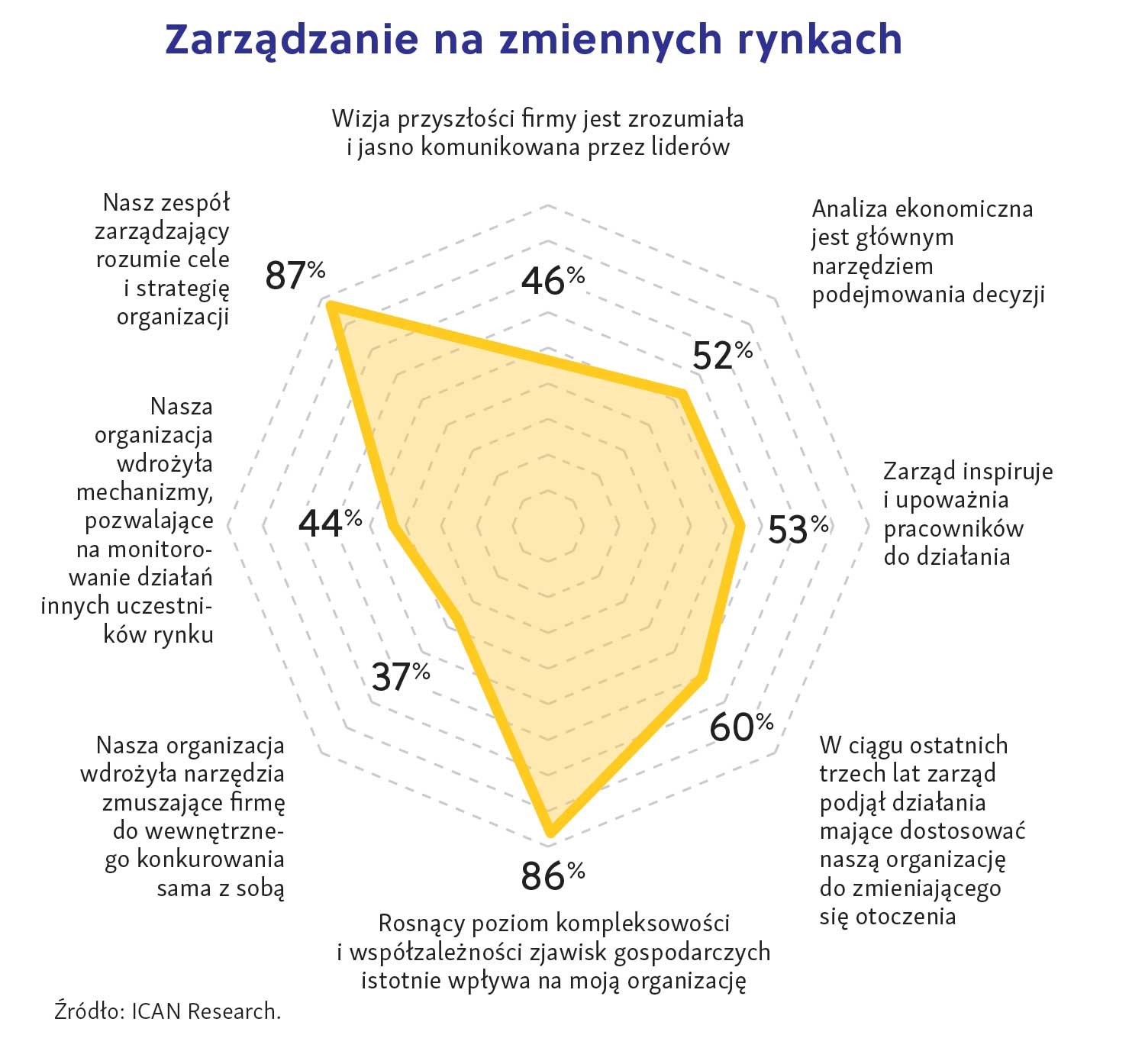 Niespotykana dotąd dynamika zmian rynkowych wprowadza organizacje w nową rzeczywistość. Tradycyjna sprzedaż i marketing już się nie sprawdzają, swoje oblicze zmienia HR, a finanse przestały już dawno być nazywane księgowością. Zespół ICAN Institute postanowił spytać polskich menedżerów, jak zmienność zjawisk rynkowych wpływa na ich biznes oraz w jaki sposób próbują się przystosować do otaczających ich zmian (zobacz ramkę O badaniu).