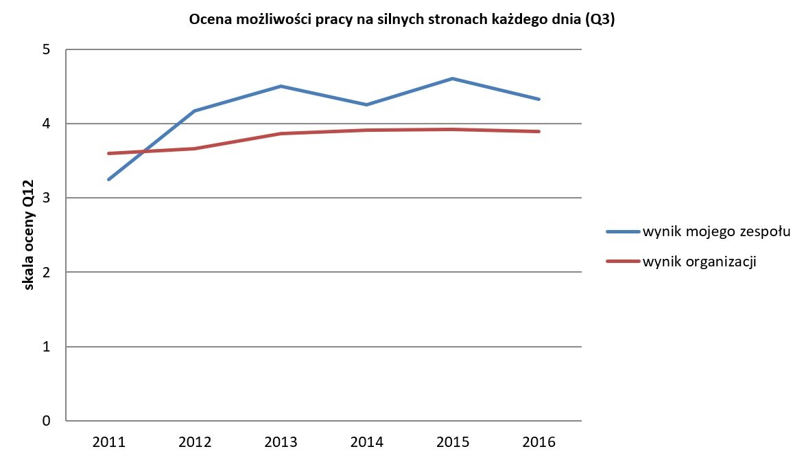 Potwierdzona w metodzie Gallupa pozytywna korelacja pomiędzy poziomem zaangażowania a możliwością wykonywania codziennie tego co się robi najlepiej (dotyczy pytania Q3 w metodologii Gallupa Q12), znajduje również odzwierciedlenie i tutaj. Ze wskazań członków zespołu wynika, iż mogą na co dzień wykorzystywać swoje silne strony, oceniając obecnie szanse na to nawet na poziomie o 42% wyższym w stosunku do tego co było kilka lat temu. Ponadto, od kilku lat nikt nie opuścił dobrowolnie drużyny na rzecz innego pracodawcy, a wskaźnik odejść nie wymaga większej uwagi.
