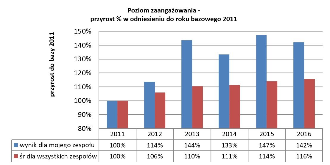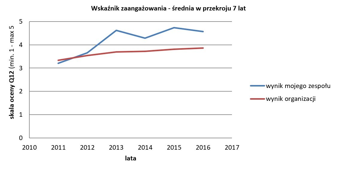 Od 2015 roku mój zespół w zakresie wyników poziomu zaangażowania plasuje się jako numer 1 spośród kilkudziesięciu zespołów objętych badaniem w organizacji. Od momentu porzucenia przeze mnie tradycyjnego modelu zarządzania na rzecz pracy na silnych stronach, średni poziom zaangażowania w zespole (dotyczy wskaźnika Wielkiej Średniej w metodologii Gallupa Q12) wzrósł nawet o 47% w stosunku do pierwszego badania, będąc równocześnie wyższy o jedną czwartą od analogicznego średniego wskaźnika dla wszystkich pozostałych zespołów objętych badaniem.