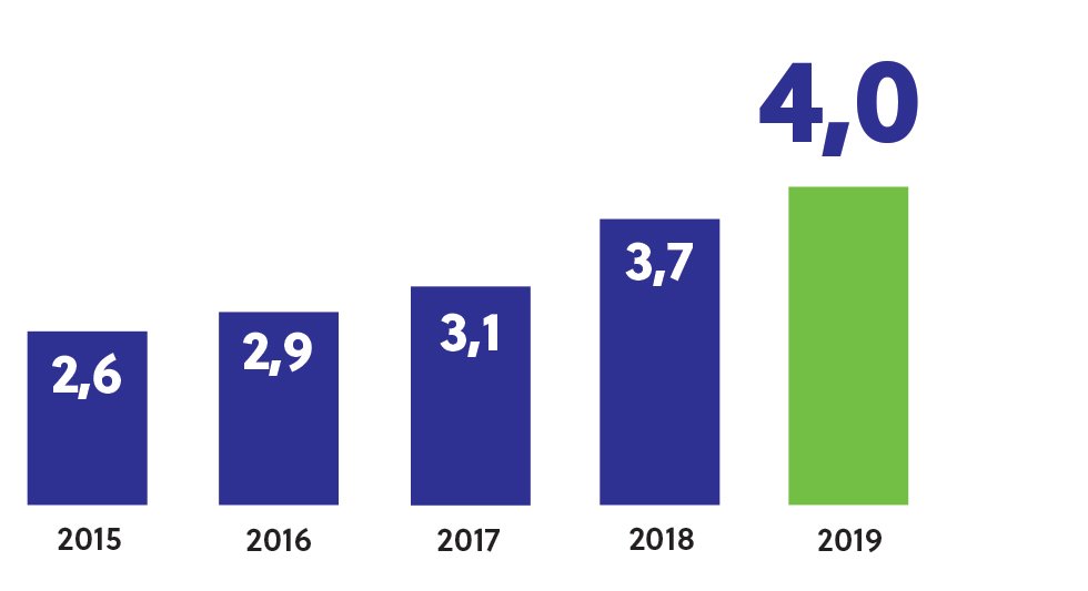 Roczny zysk netto PKO BP w latach 2015–2019 (w mld zł)
